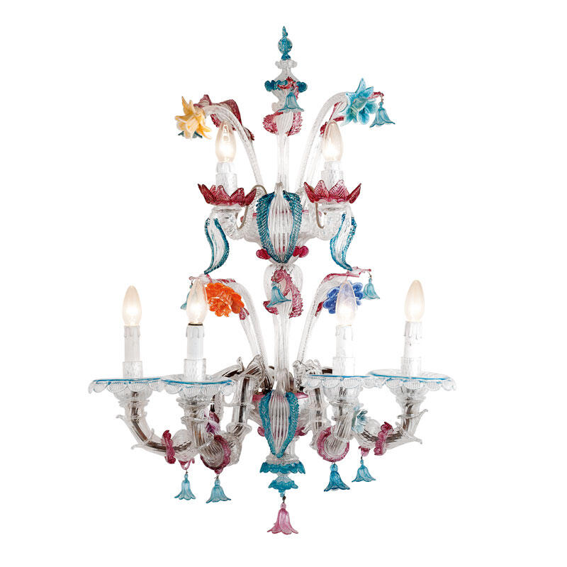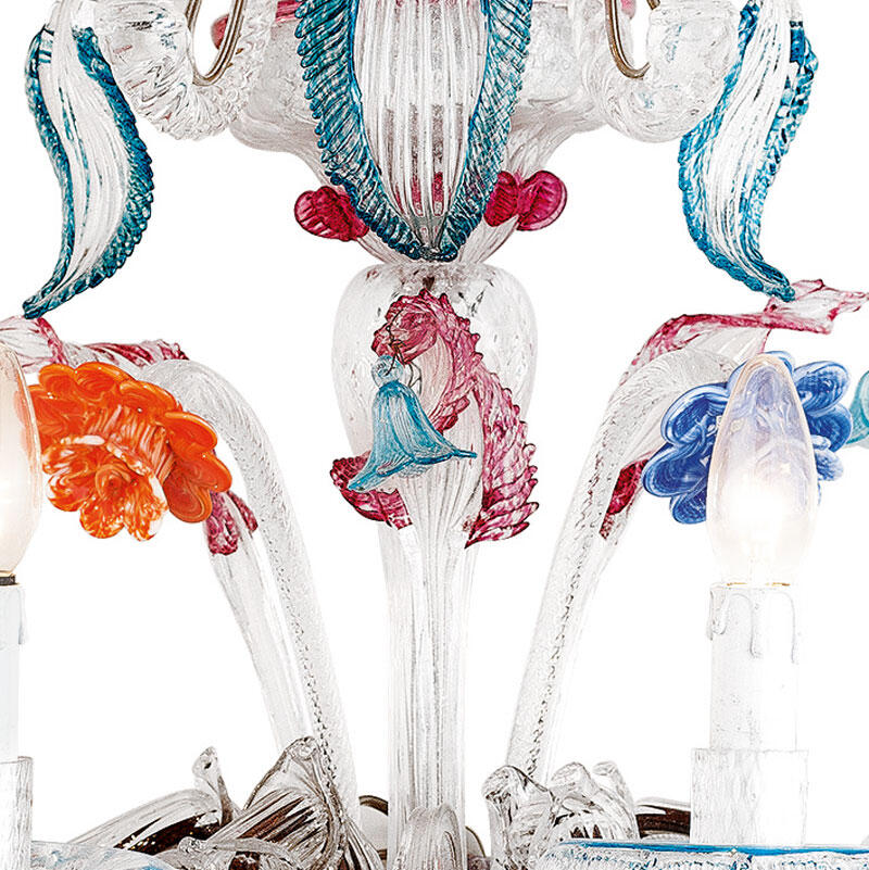 Crystal and multicoloured Murano glass with 6 lights arranged on two levels.