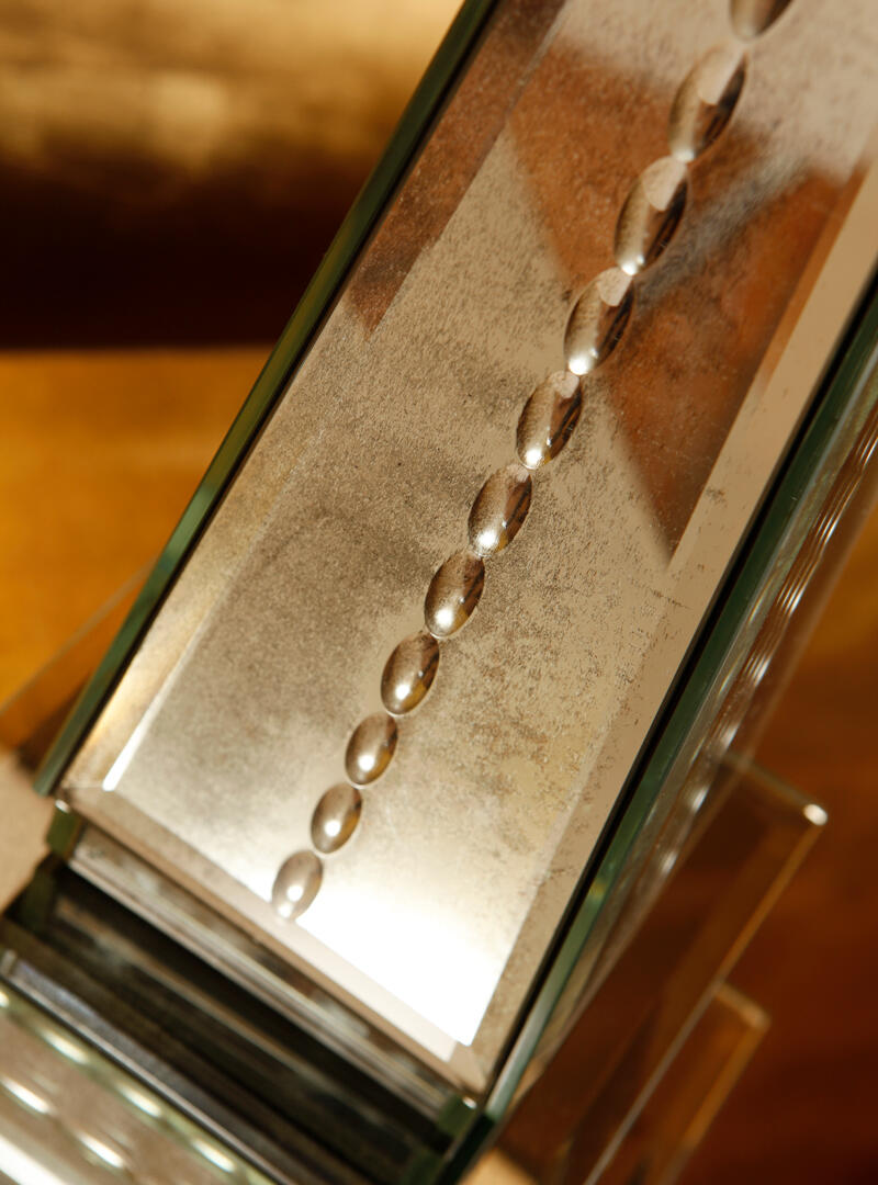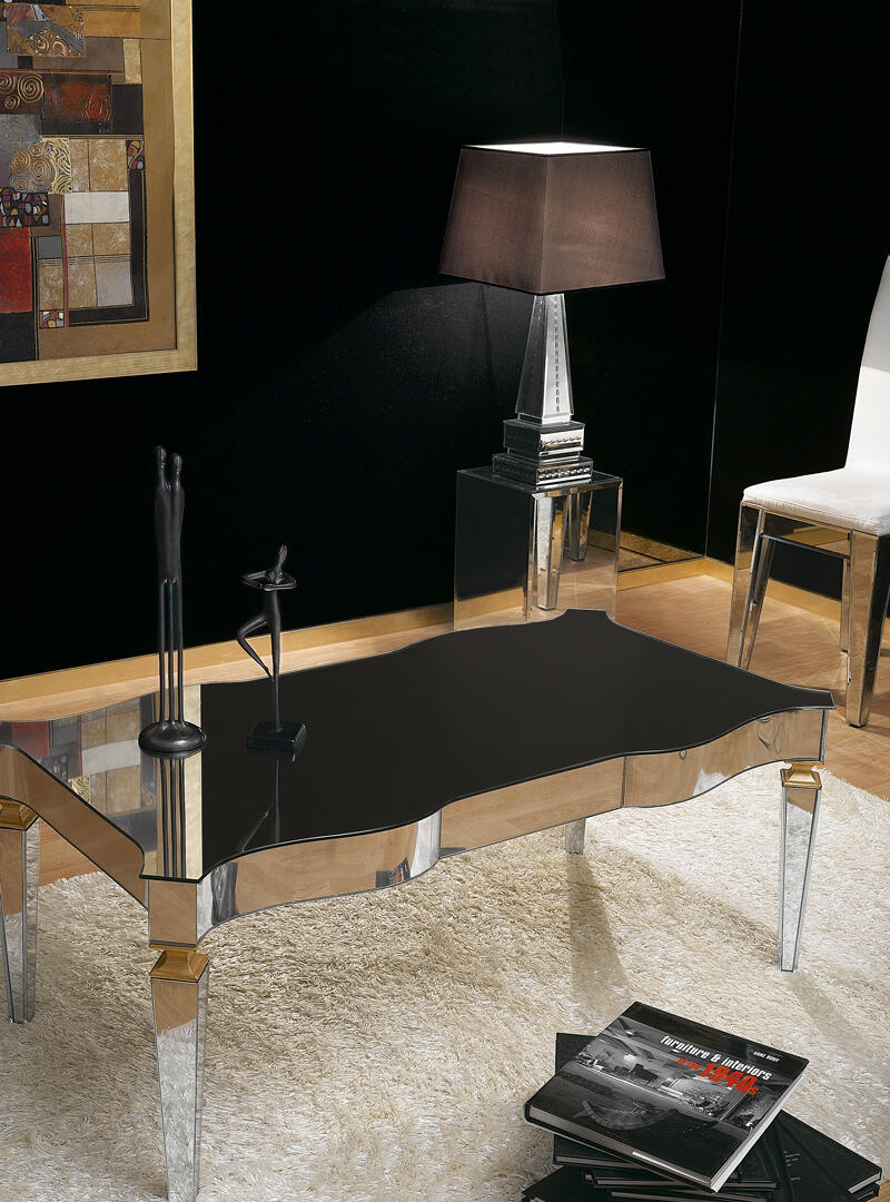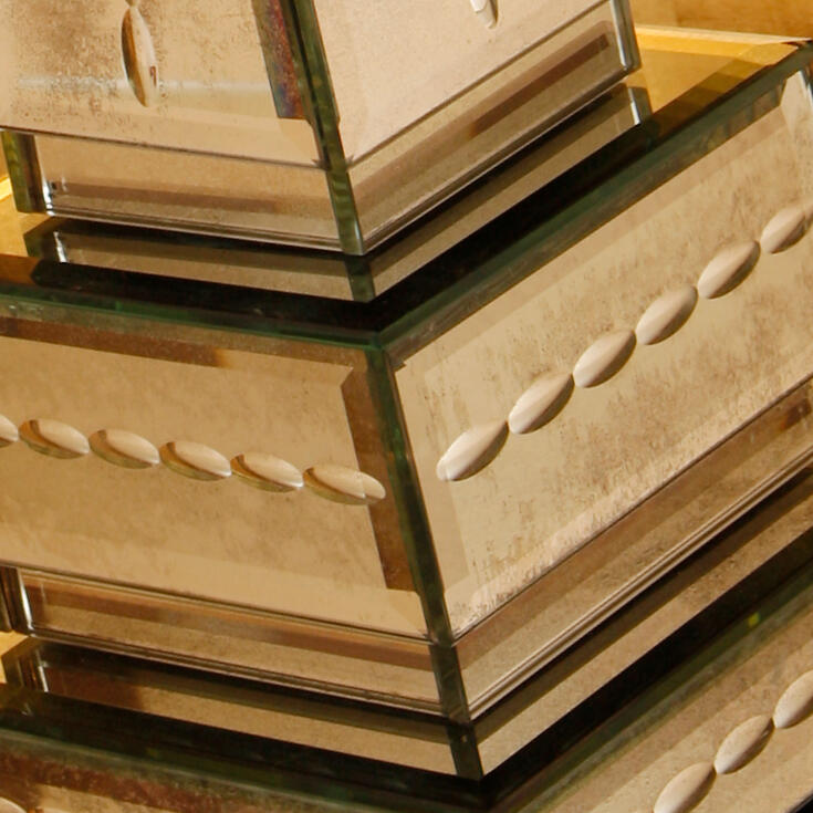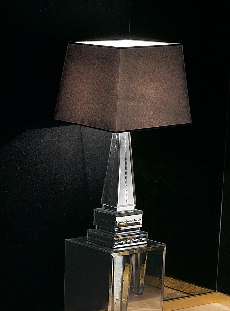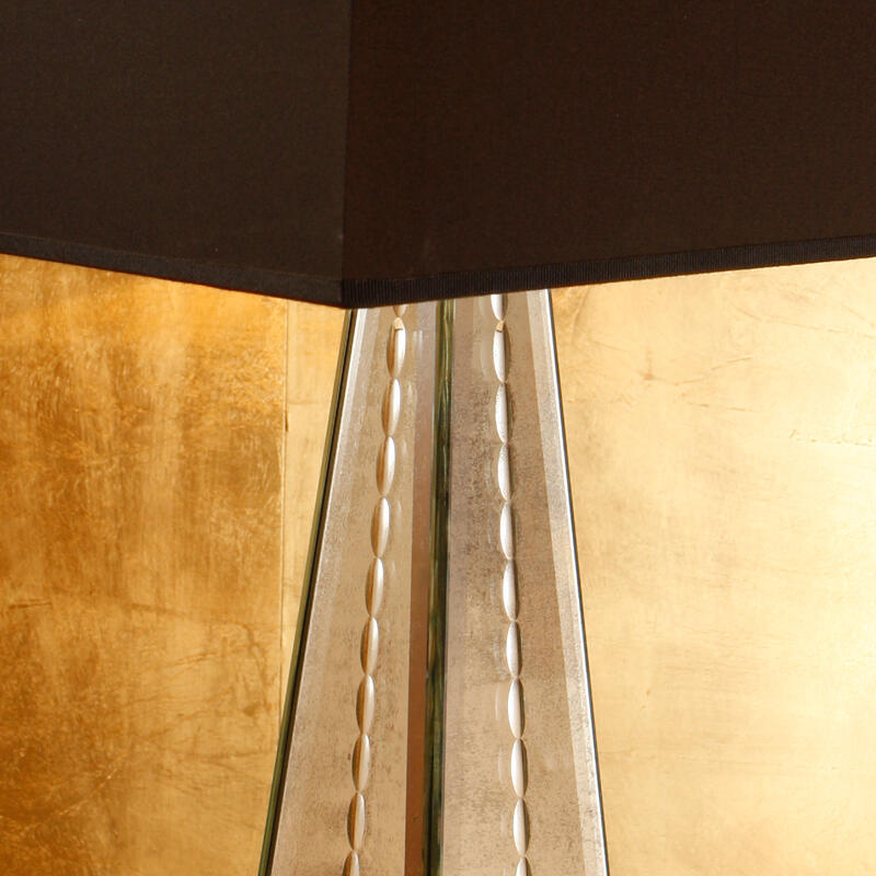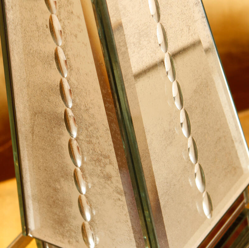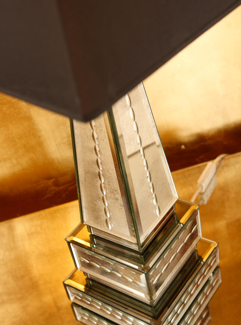 Art Déco table lamp covered in bevelled, hand engraved antiqued mirror with one light.