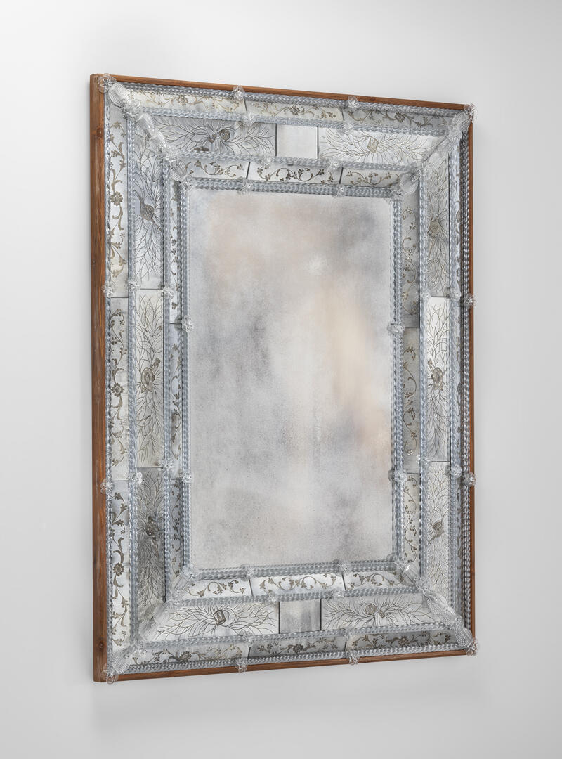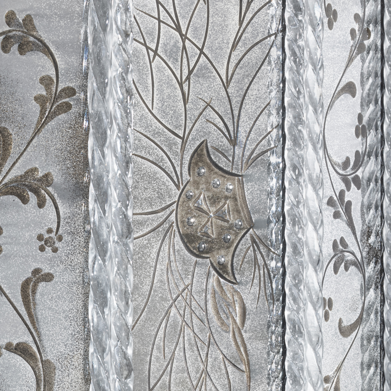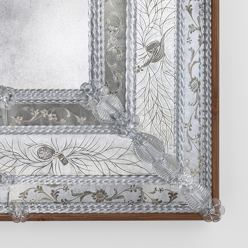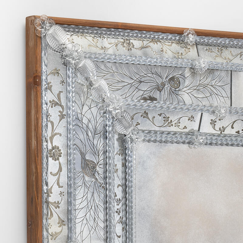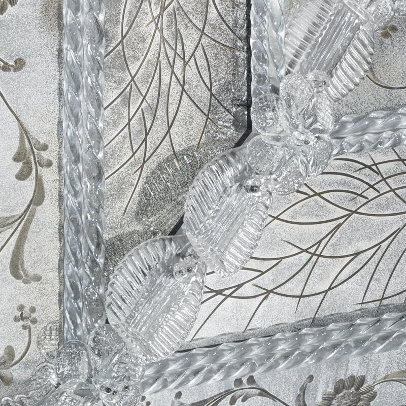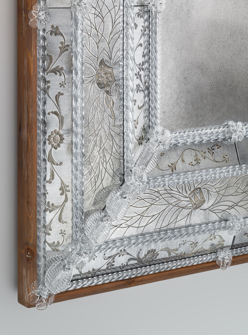 The most famous characters are the typical engraved curl finishings together with the depiction of Bacco, Justice or the well-know Venetian Eighteenth-century Dama and Cavaliere. Crystal colored Murano decorative flowers, leaves, twisted ropes and multicoloured glass paste rosettes embellish each Venetian mirror. The result is a unique item comparable to a work of art for craftsmanship and excellence in its execution.