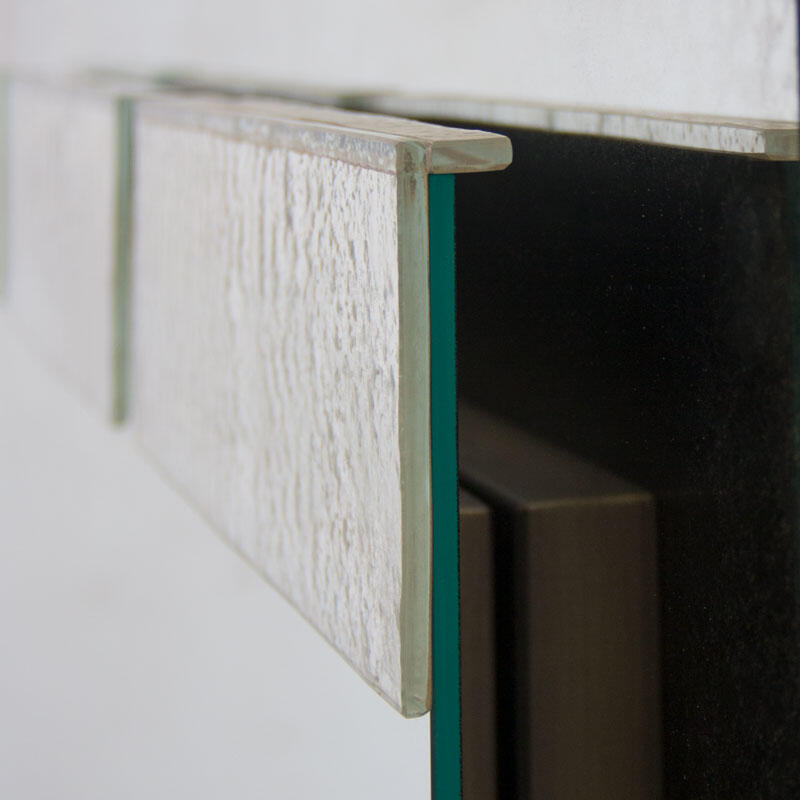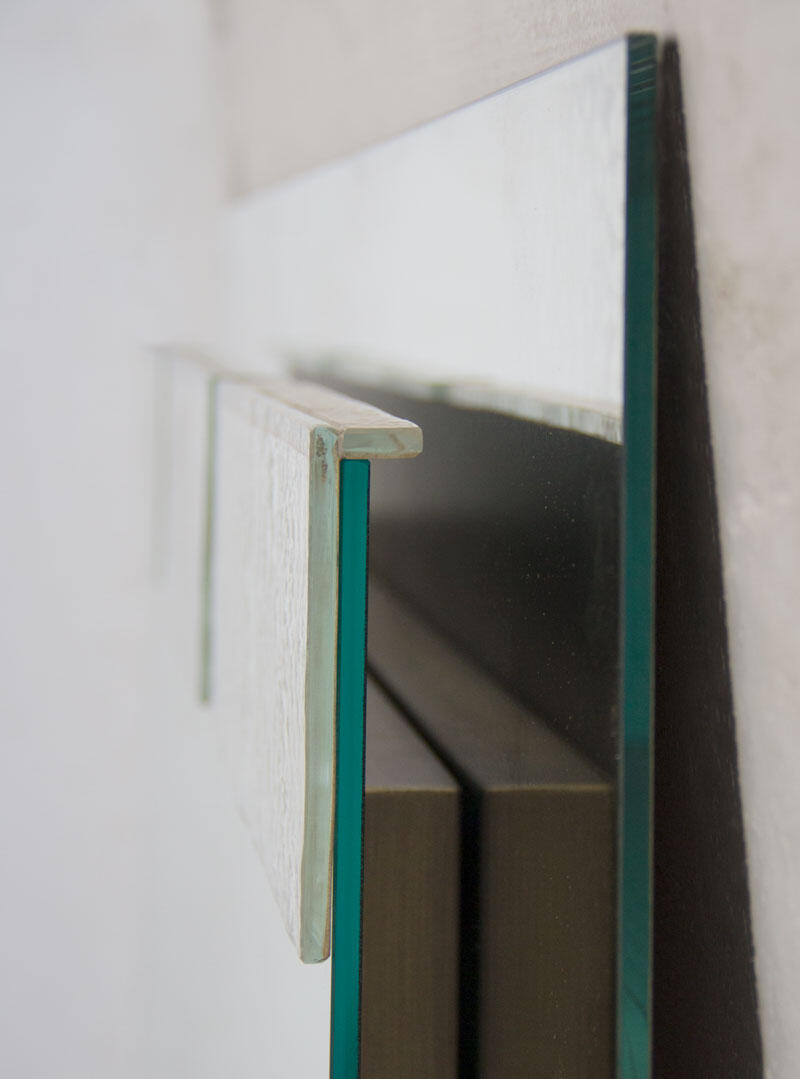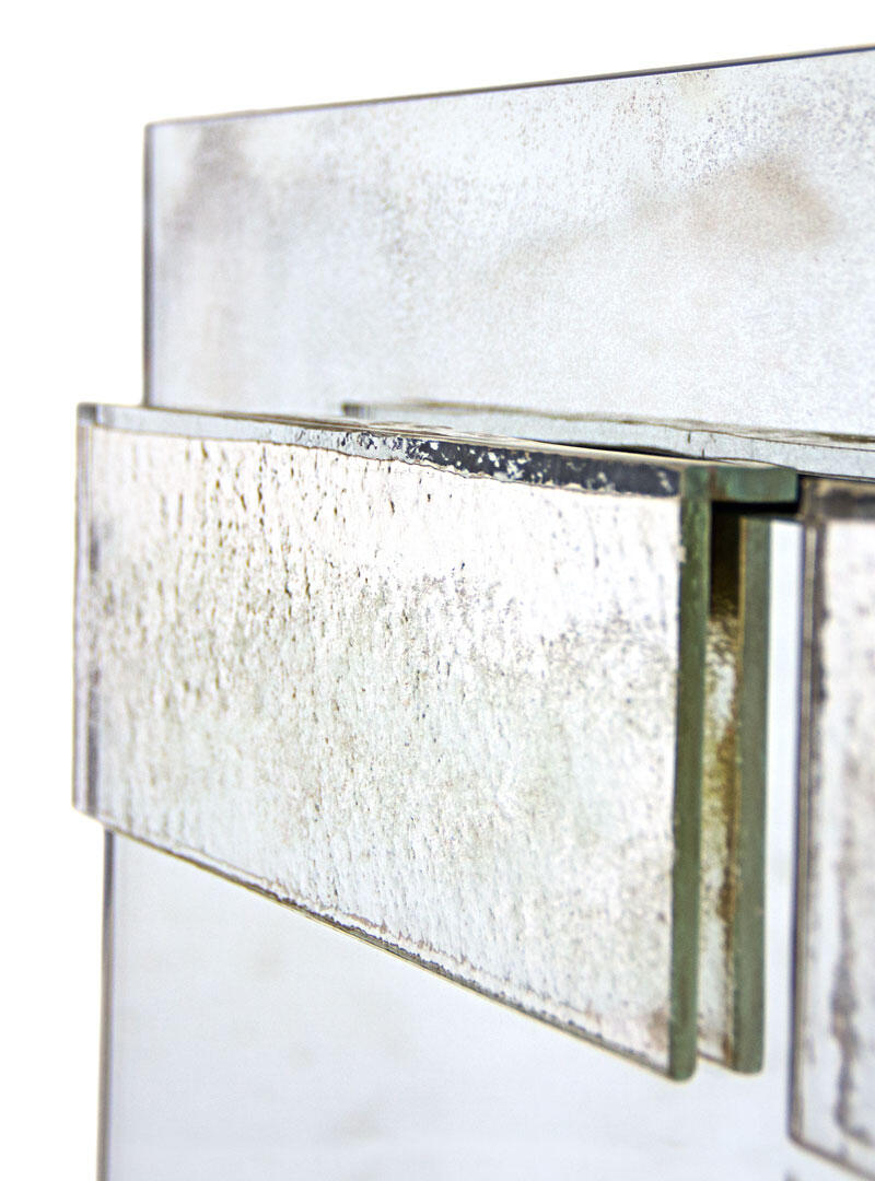 Six decorative tiles on the front side made of backing glass with a partially mirrored finish.