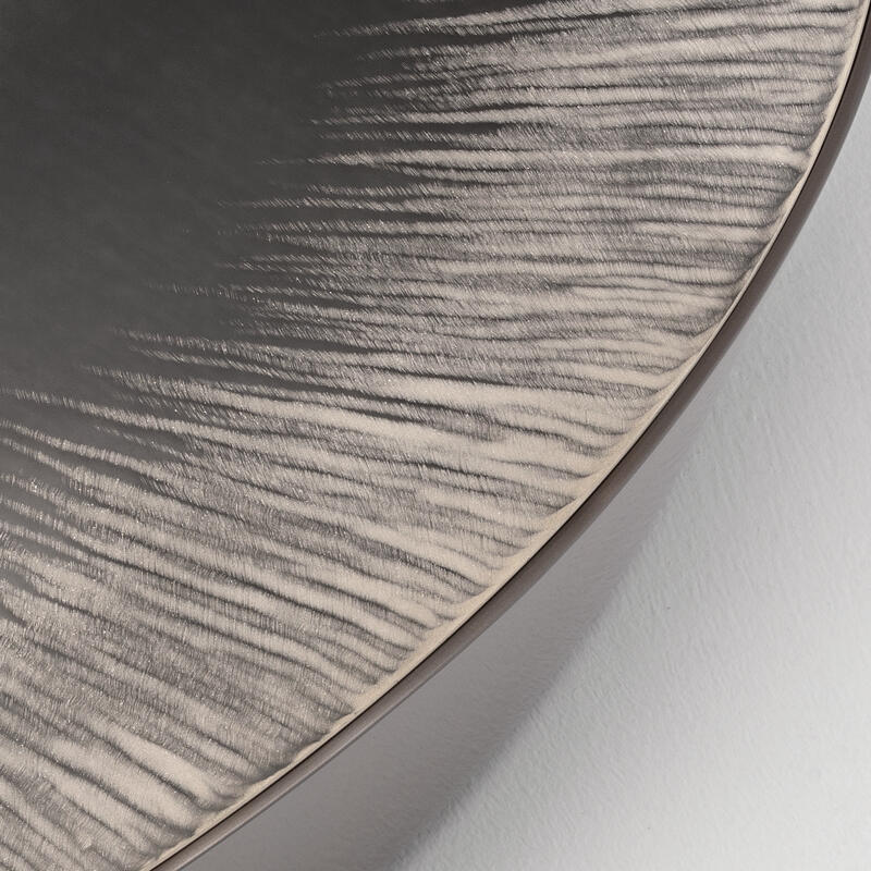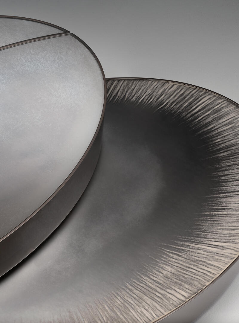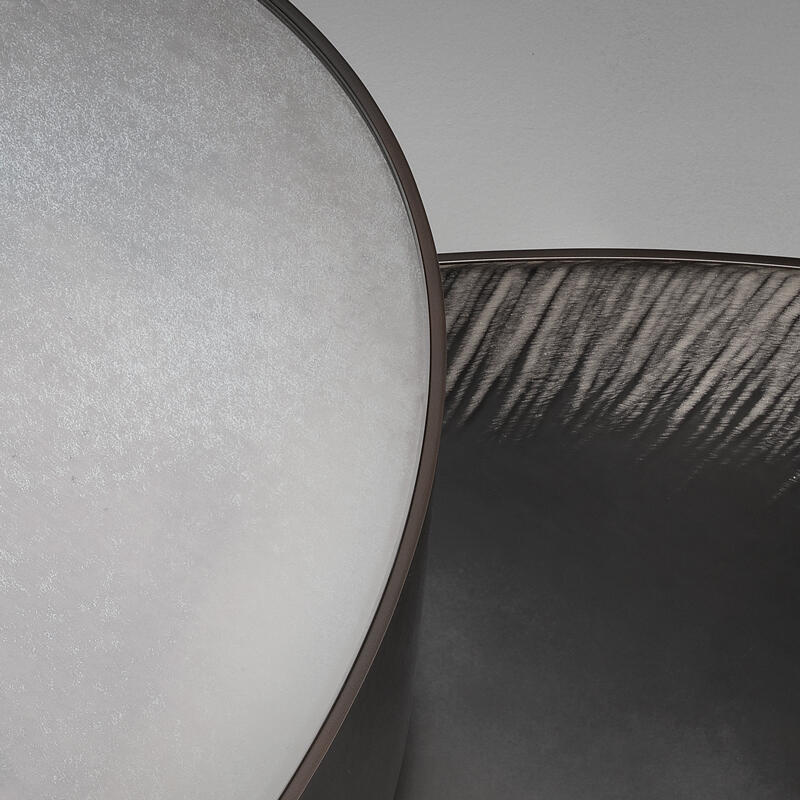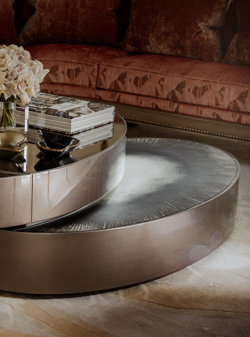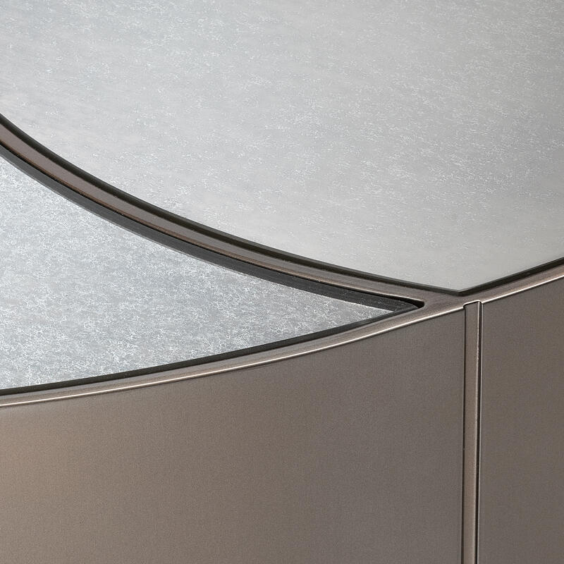 Lower top made in extra-clear acid-etched glass, 6 mm thick, hand engraved with Caigo finish and hand silvered with fading effect.