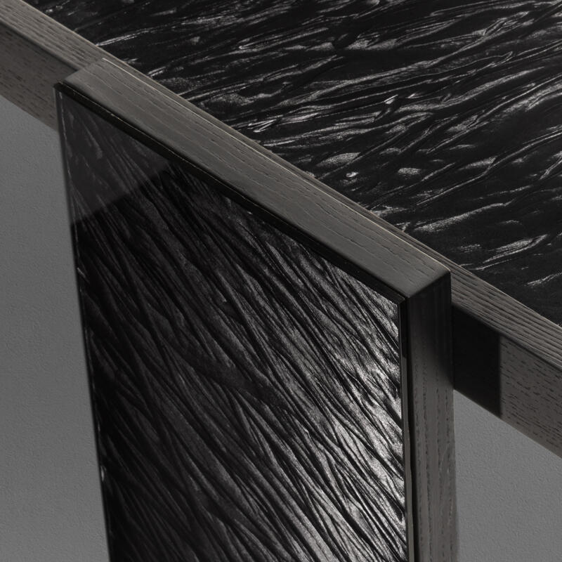 Top and front leg cover in extra-clear engraved glass.